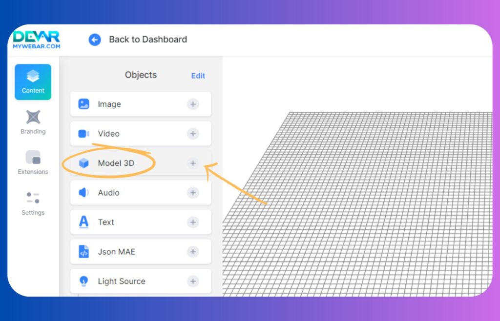 In the Content tab, find the Model 3D and click on the plus sign.