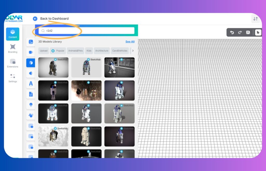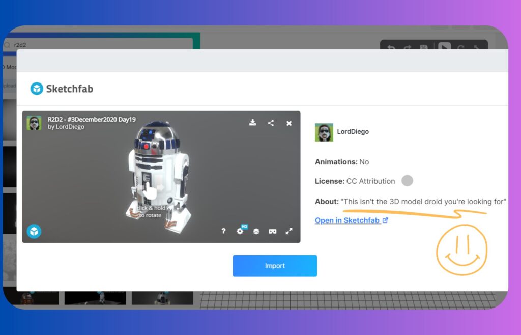 Enter the name of the 3D model ― for example R2-D2 ― in the search box and select the appropriate one from the 3D Model Library. Some of the 3D models can be imported from Sketchfab, but you need to register here.