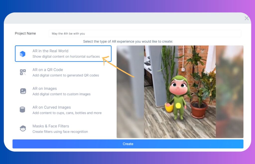Create a new project. Select the type of AR experience as an AR in the Real World.