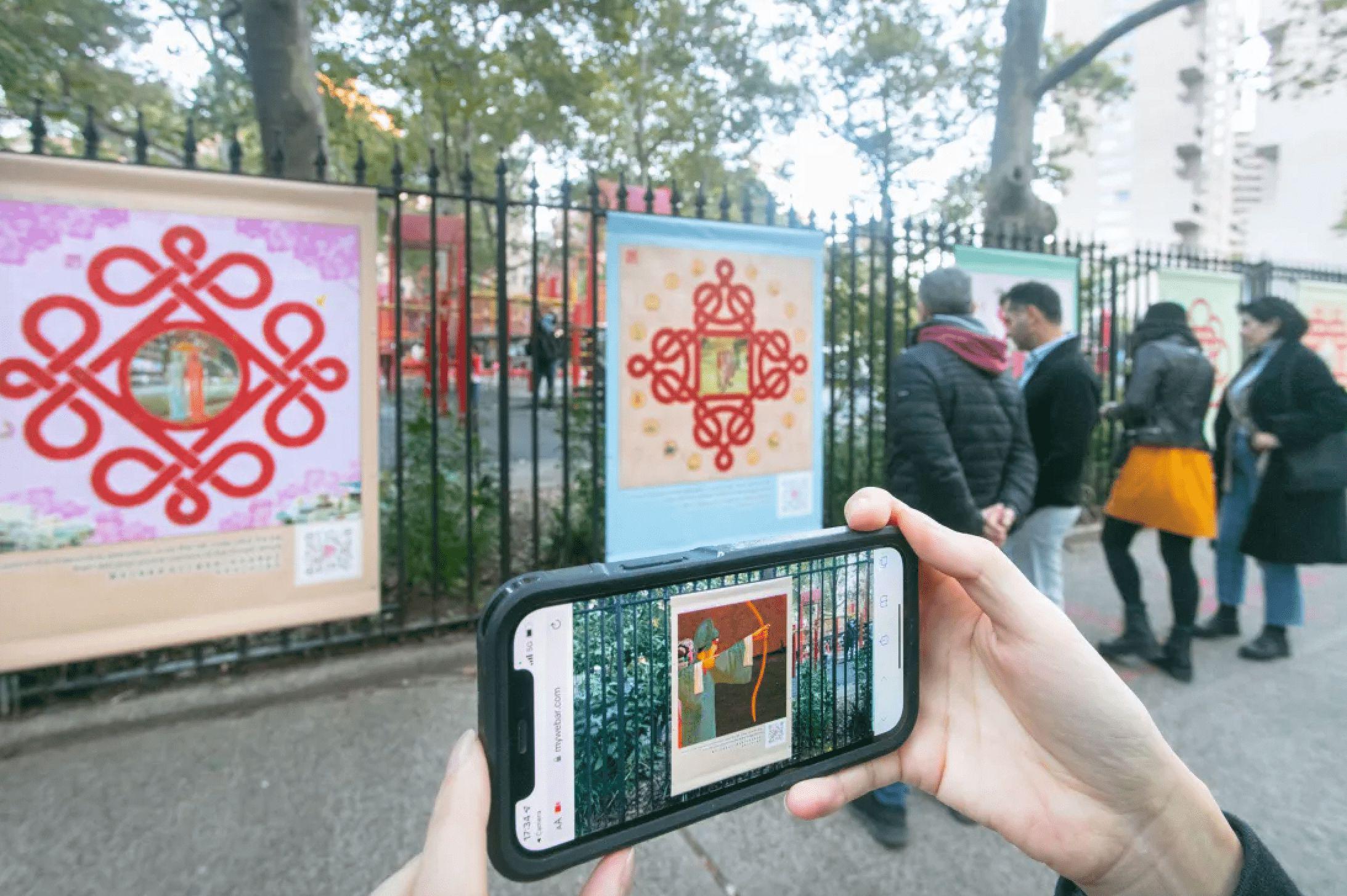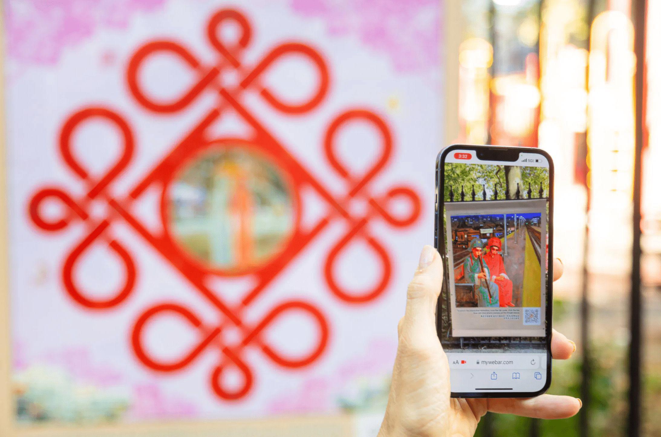The project’s installation comprised a series of large banners featuring traditional Chinese patterns, also known as ‘red strings.’ These banners were placed on fences in public parks, near benches and tables where visitors gather daily. Digital components included Augmented Reality for mobile phones: short animations inspired by East Asian folktales and traditional opera performances. By scanning QR codes, park visitors could enjoy interactive animations overlaying the banners, as well as fragments of artistic videos by Lily & Honglei.