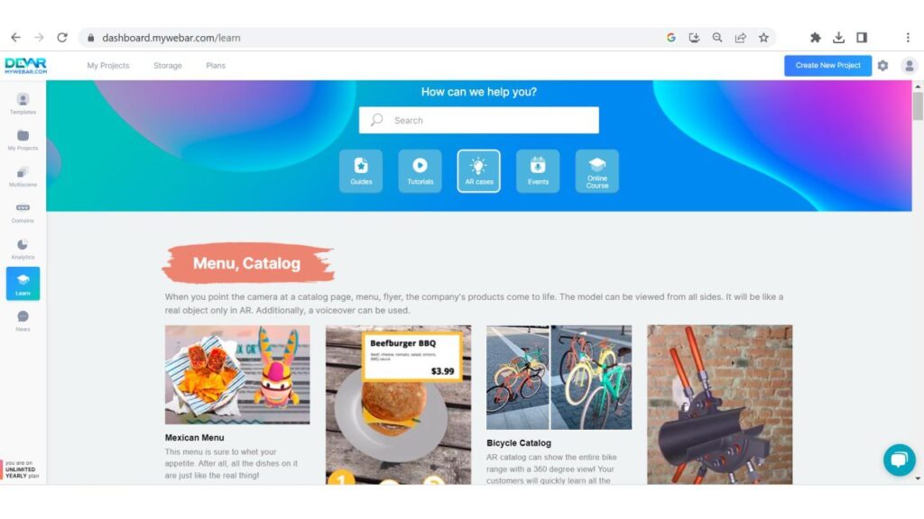 2. Look at other AR projects: Look at other Augmented Reality projects that have been developed by other individuals or companies. This can give you an idea of what’s possible with AR and help you identify areas where you can innovate. Find more inspiration at the learning center in your dashboard.