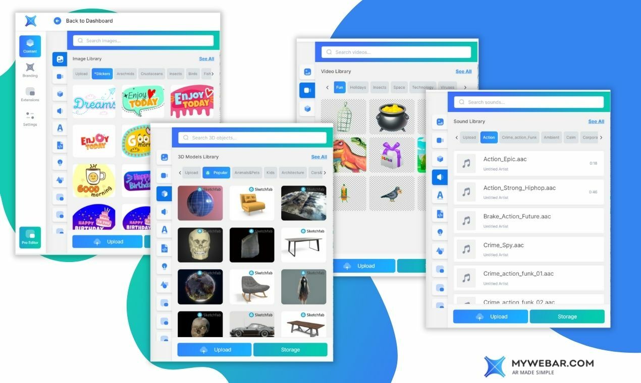 3D Models. Use Sketchfab integration and 1000+ simple and animated 3D models from the MyWebAR library. Also, add your models as GLB, FBX, and DAE files.