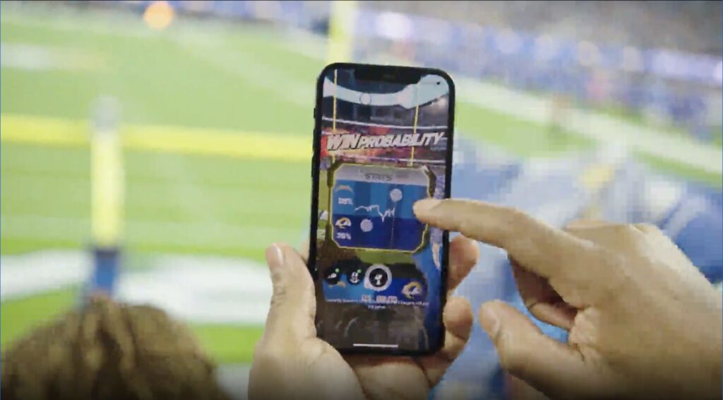 Verizon is promoting exclusive AR filters through the app, allowing fans to choose one of four teams in a cheering-based game. Based on activity and fans’ involvement with the filters, an AR overlay shown on the field will encourage them to cheer on their squad. In previous Super Bowls, this technology supported fewer than 100 users. In 2022, more than 10,000 users connected at the same time. Fans also were able to check the statistics during the game by using augmented reality.