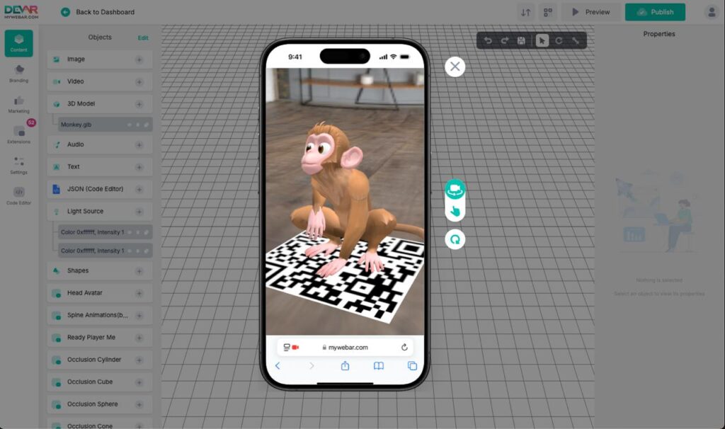 Testing should feel like using the thing. The updated preview gives you two ways to look at your scene before you scan a QR code. In real-world view, you get a sense of scale and placement, almost like peeking through a phone. In touch interaction mode, you orbit, pan, and zoom with your fingers to check hotspots, labels, and tap targets.