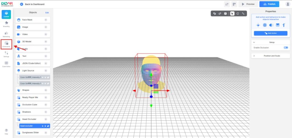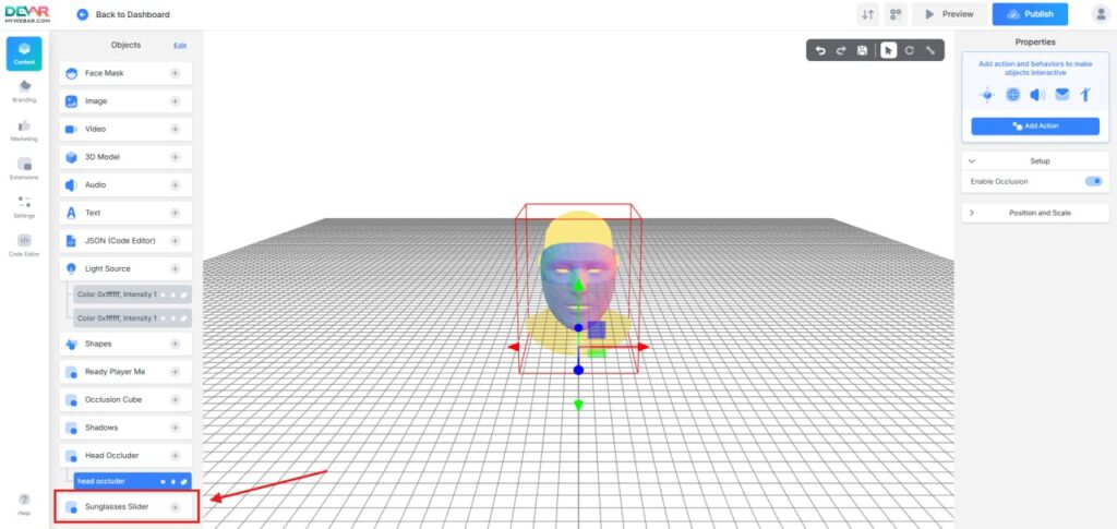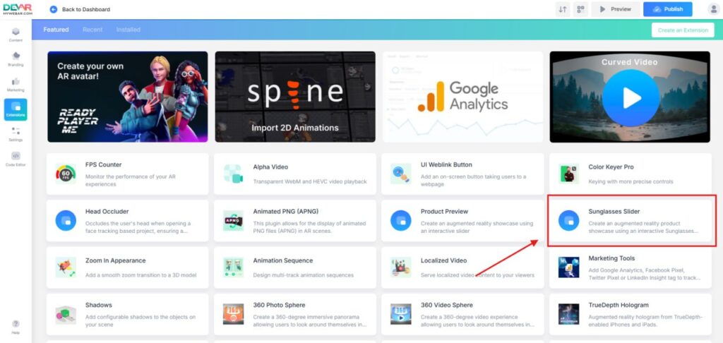 In the left sidebar, open Extensions, find Sunglasses Slider, and install it. Then go to Objects and press “+” to add the plugin to your scene.