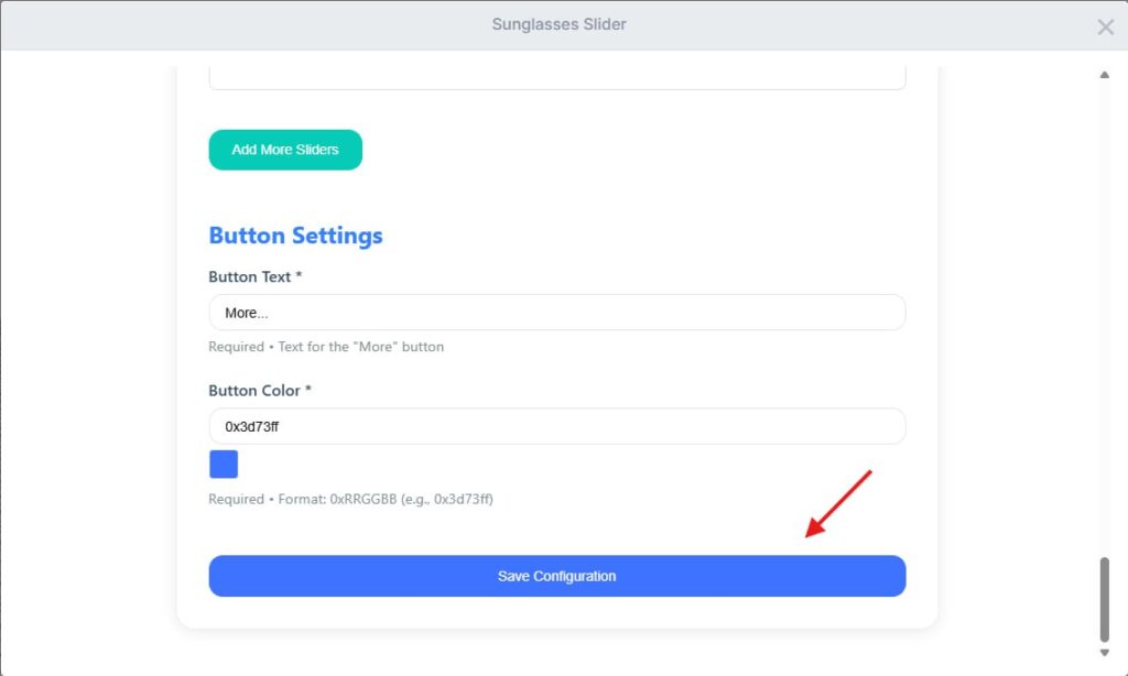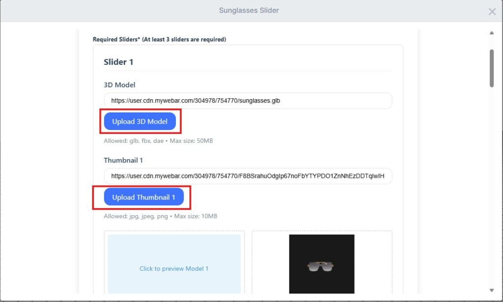 For each slide, upload the .glb model and the matching thumbnail. Do this for all four frames. When everything looks right, click Save Configuration.