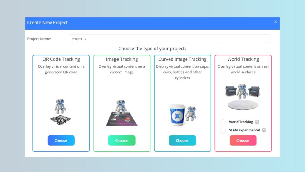 MyWebAR allows you to create different augmented reality projects based on their types of tracking, including QR code tracking, image tracking, world tracking and SLAM. Now we add one more type of tracking – curved image tracking.