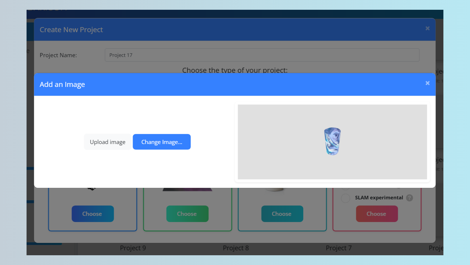 Create augmented reality projects by using cylinders. Augmented reality content will be displayed over a custom image around, behind or on the front of the cylinder. Selecting this project type will prompt you to upload the target image file which is your bottle label or just extended cylinder form.