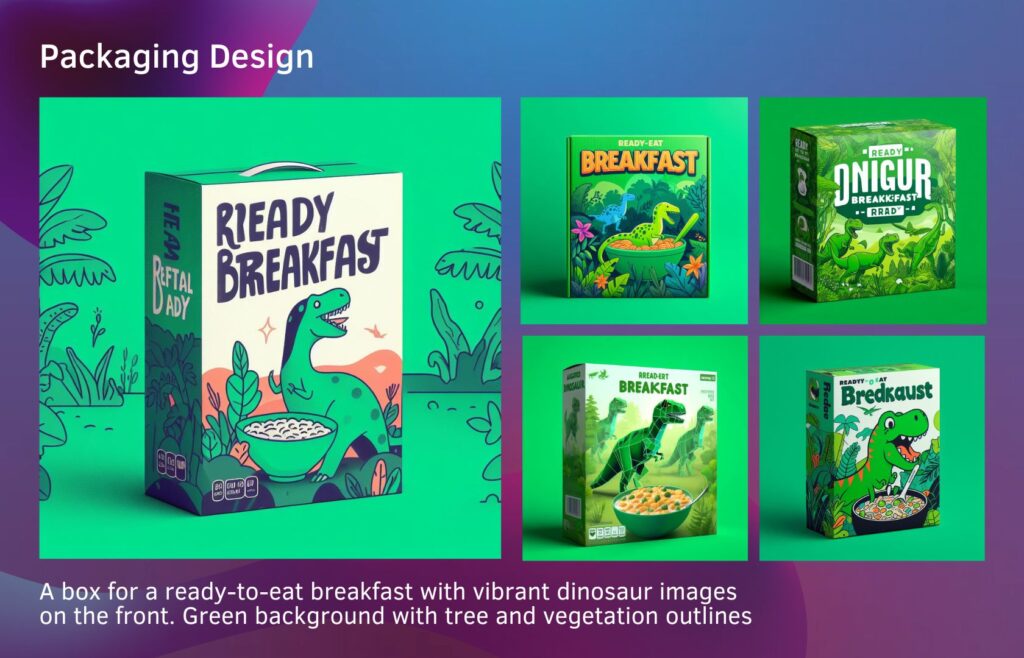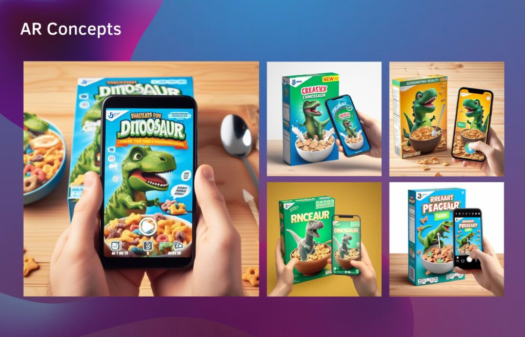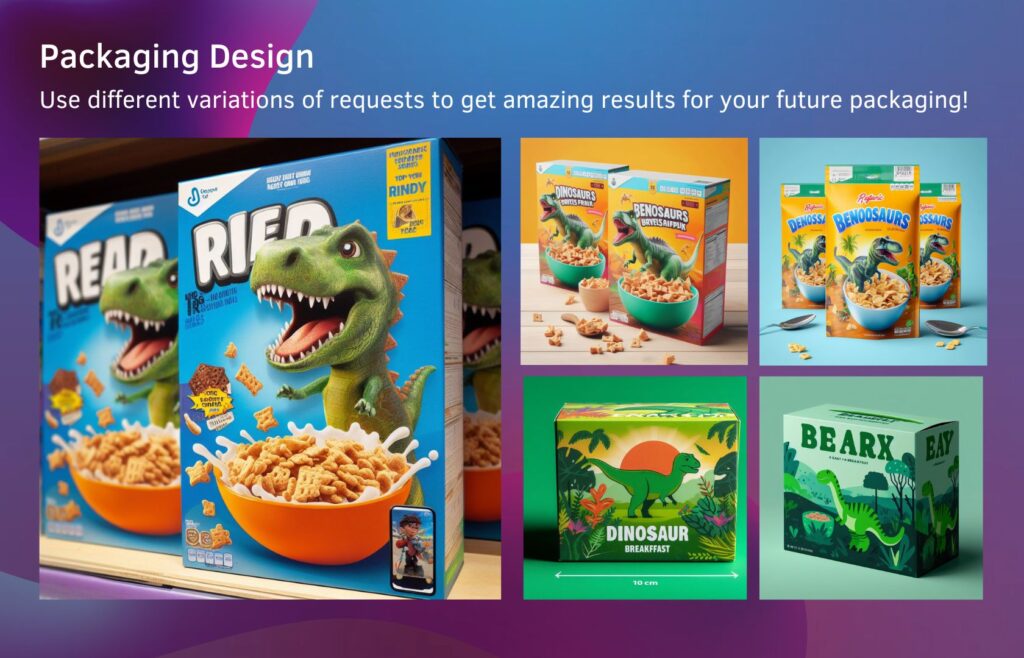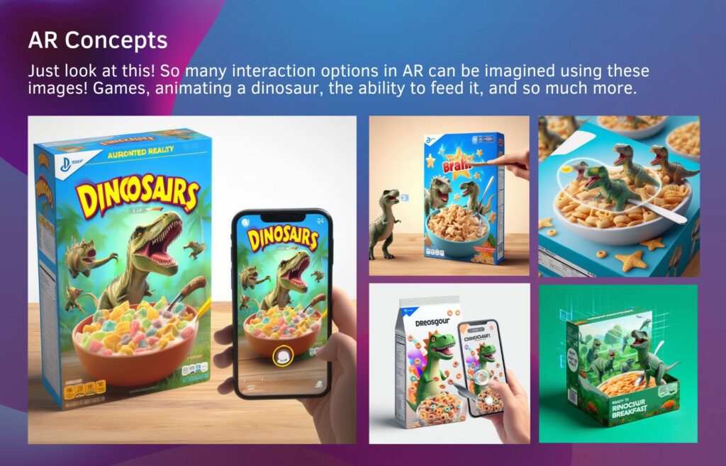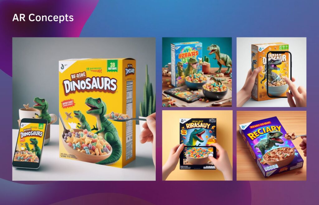 By using DALL-E 3, you can quickly generate concepts and a rough design for a dinosaur-themed box for a ready-to-eat breakfast, allowing you to visualize the idea and reproduce it more accurately in augmented reality.