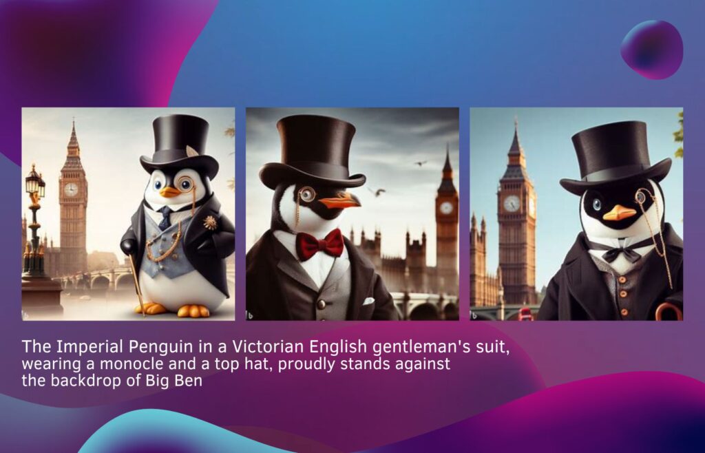 And it’s also fun! Here’s an example of how DALL-E 3 turned the sentence “The Imperial Penguin in a Victorian English gentleman’s suit, wearing a monocle and a top hat, proudly stands against the backdrop of Big Ben” into a series of amusing images: